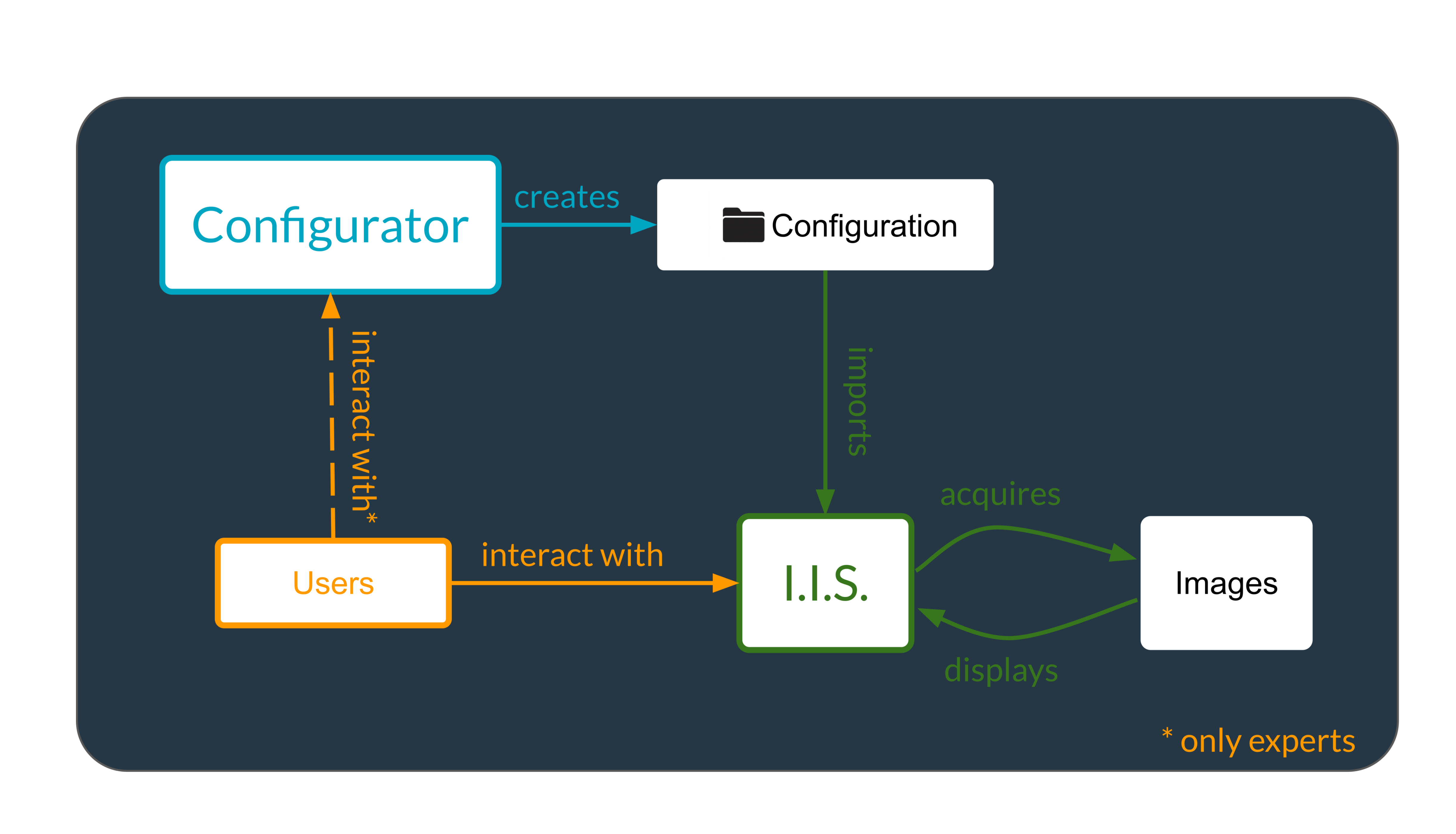 User Interactions and Software Workflow: The diagram below shows how users interact with the Imaging Software and the Configurator. It highlights how these tools work together to produce images. The goal is to clarify the functional workflow from user input to image generation.