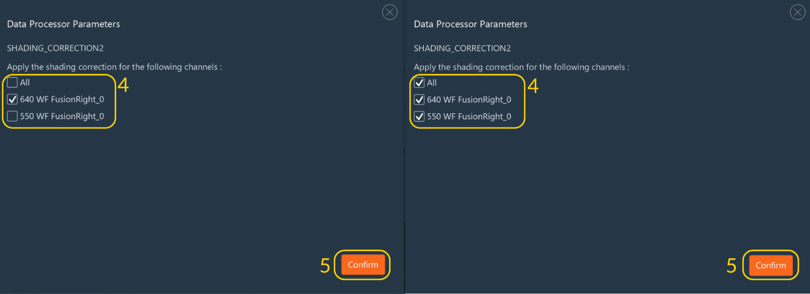 - Select the channel(s) on which you want to apply the shading correction — it can be a single channel or all channels.